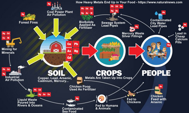 For farmers, chemical fertilizers, human sewage (BioSolids), and manure from animals given metal laden feed all contribute to the build up of heavy metals in our soils and the subsequent contamination of our crops. Furthermore, due to poor stewardship/naiveté, the soils in some areas of the country have been badly contaminated such that crops grown in these areas will likewise be contaminated. And finally, even organic farmers with relatively clean soil need to be careful about the materials they use as the case in New Zealand demonstrates wherein phosphate fertilizers were made using rock from the island of Nauru containing high amounts of the heavy metal cadmium